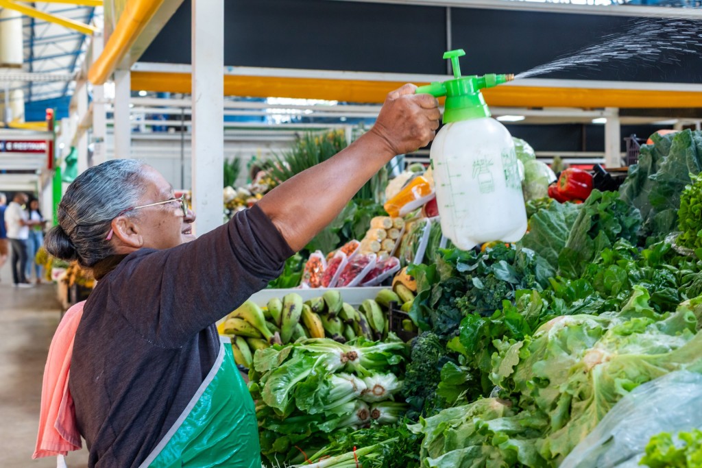 A imagem que acompanha a matéria mostra uma permissionária do Mercado do Porto em seu box de trabalho.