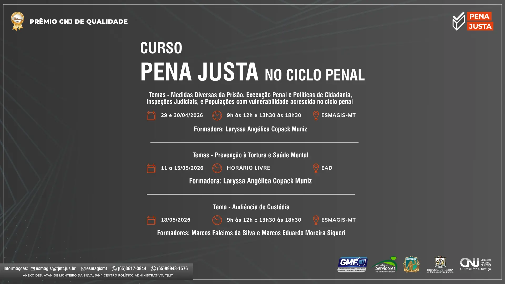 O primeiro módulo ocorrerá nos dias 29 e 30 de abril, na Sala Cajazeira (Esmagis‑MT), sob a condução da magistrada Laryssa Angélica Copack Muniz, abrangendo conteúdos relacionados às medidas diversas da prisão, execução penal, políticas de cidadania, inspeções judiciais e populações em situação de vulnerabilidade acrescida no ciclo penal. As aulas serão ofertadas das 9h às 12h e das 13h30 às 18h30.