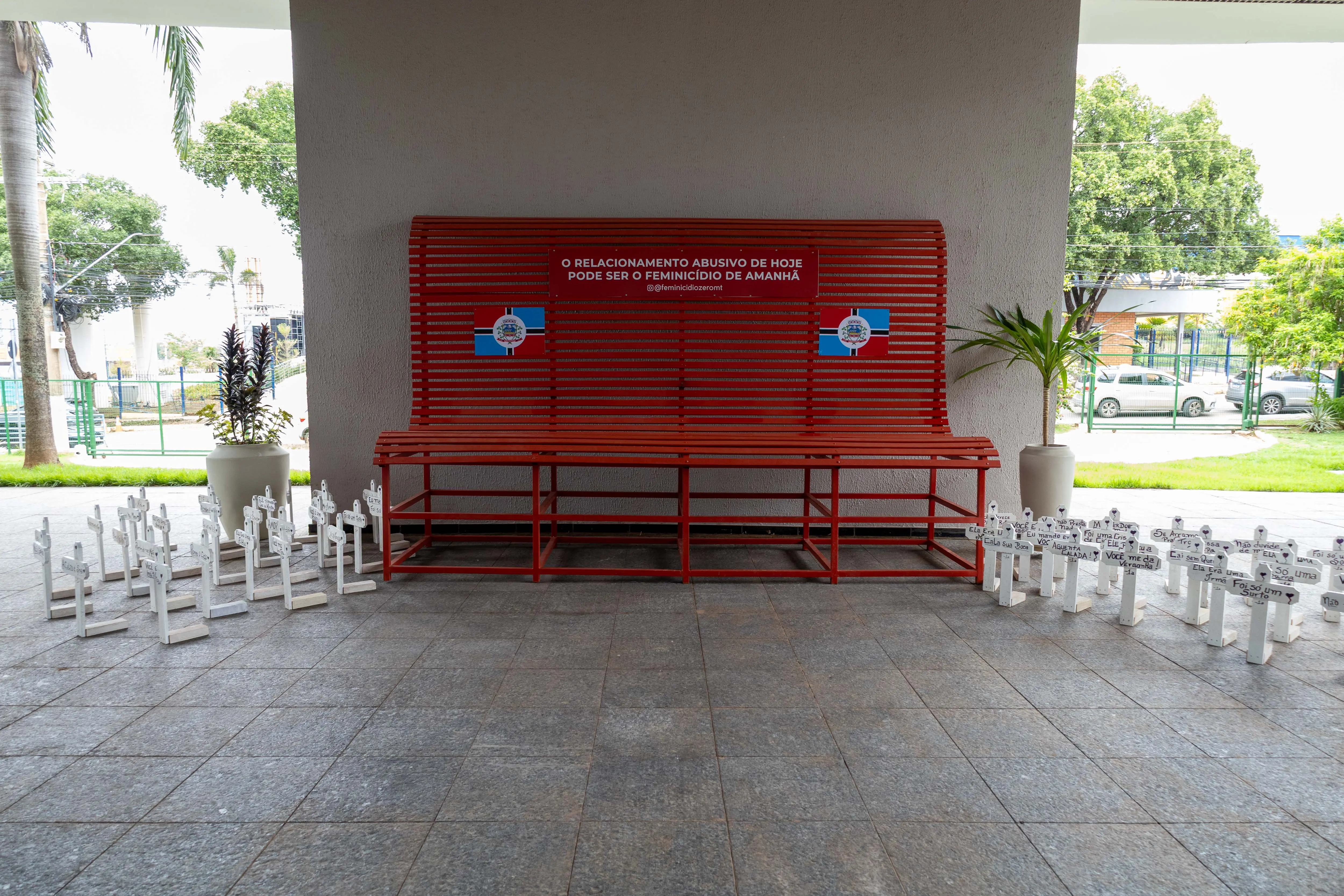 Estandes de Redes de Enfrentamento estão montadas no local do evento, cruzes brancas, simbolizando mulheres vítimas de feminicídio, assim como banco gigante vermelho, uma política pública instituída pela Lei nº 14.942/2024, que determina a instalação de bancos pintados na cor vermelha em espaços públicos, acompanhados de mensagens reflexivas e informações de apoio. A proposta visa provocar reflexão, homenagear vítimas e estimular ações de enfrentamento à violência de gênero.